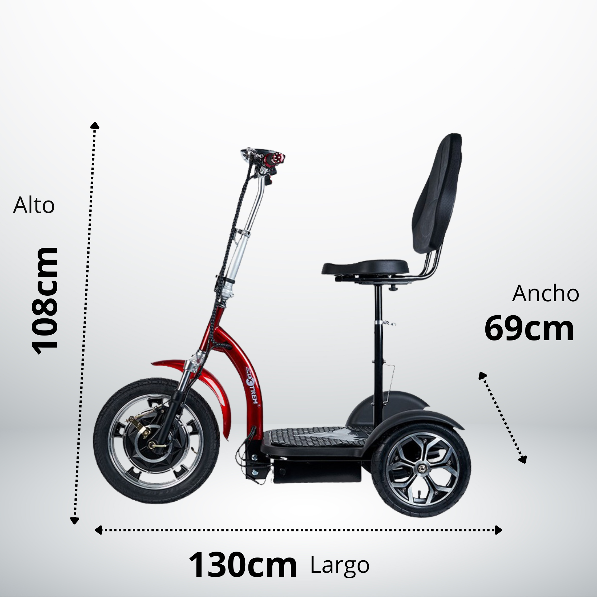 Con el triciclo está disponible en color negro,verde,plata y rojo. Con él podrás alcanzar los 25 Km/hy hacer un recorrido máximo de 20-30 Km, suficiente para poder hacer todos tus recodos o disfrutar de paseos por la ciudad.